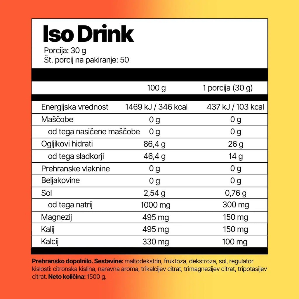Prehransko dopolnilo. Sestavine: maltodekstrin, fruktoza, dekstroza, sol, regulator kislosti: citronska kislina, naravna aroma, trikalcijev citrat, trimagnezijev citrat, tripotasijev citrat. Neto količina: 1500 g.