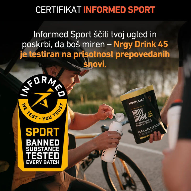 Nrgy Drink 45 združuje dve ključni komponenti: znanstveno podprto razmerje glukoze in fruktoze 1 : 0,8 za največjo absorpcijo ogljikovih hidratov ter Nduranz Electrolyte Mix – mineralni profil, ki posnema znoj za optimalno hidracijo.