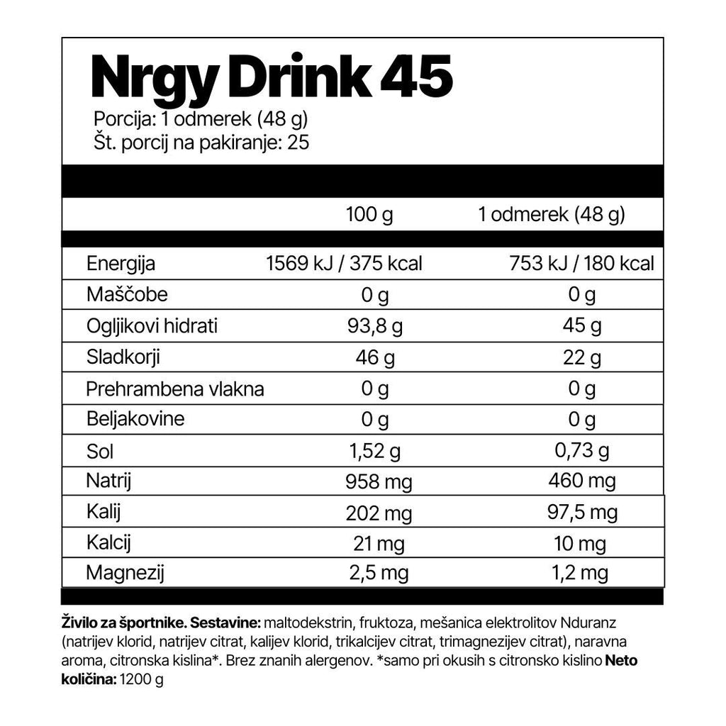 Izotonični napitek Nrgy Drink 45 je ustvarjen za vrhunske športnike, ki med intenzivno vadbo potrebujejo visok vnos energije in optimalno hidracijo brez nepotrebnih sestavin in prebavnih težav.