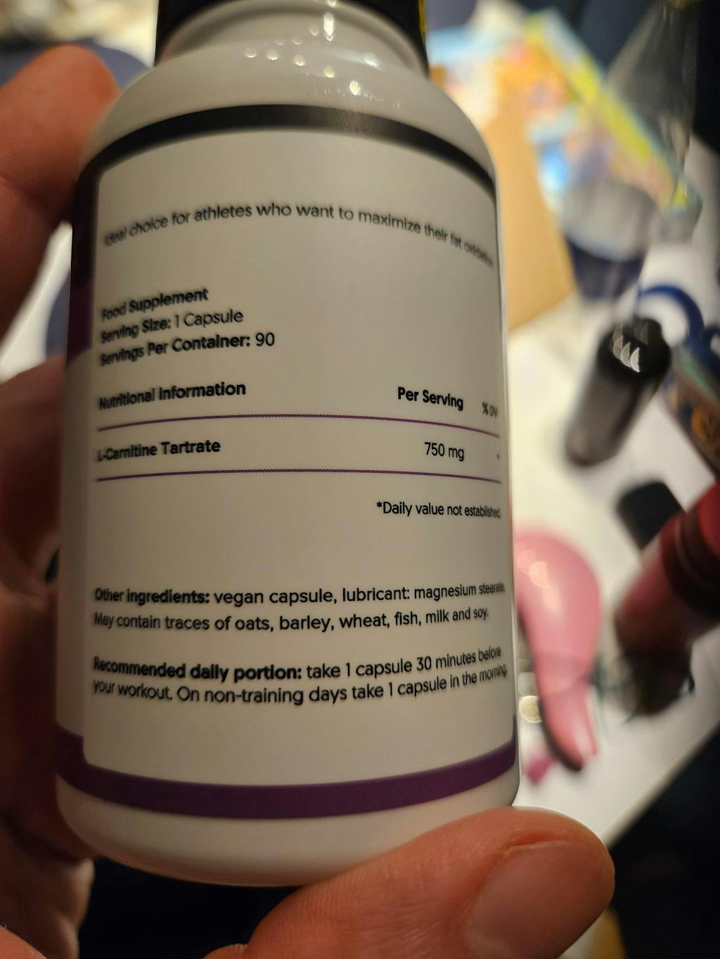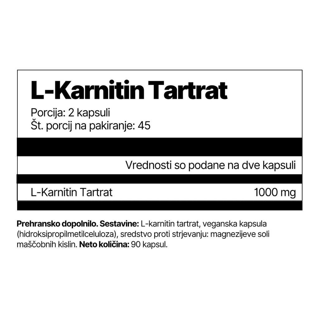 Prehransko dopolnilo. Sestavine: L-karnitin tartrat, veganska kapsula (hidroksipropilmetilceluloza), sredstvo proti strjevanju: magnezijeve soli maščobnih kislin. Neto količina: 90 kapsul.