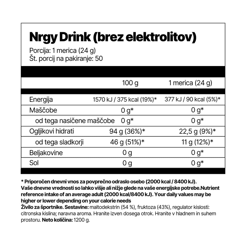 Nrgy Drink je napitek z ogljikovimi hidrati za vrhunsko zmogljivost. Primeren je za športnike, ki želijo natančen nadzor nad vnosom energije. Vsaka merica vsebuje 22,5 gramov ogljikovih hidratov v znanstveno podprtem razmerju glukoze in fruktoze 1 : 0,8. Izdelek ti omogoča povečati vnos energije brez dodatnih elektrolitov.