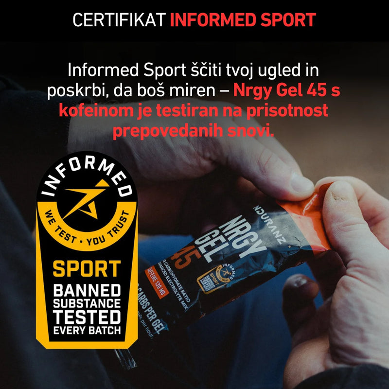 Vsaka serija Nrgy Gel 45 s kofeinom je testirana na prepovedane snovi v okviru programa Informed Sport. To pomeni, da lahko brez skrbi uživaš gel – tvoja zmogljivost ostaja čista, tvoj ugled pa nedotaknjen.